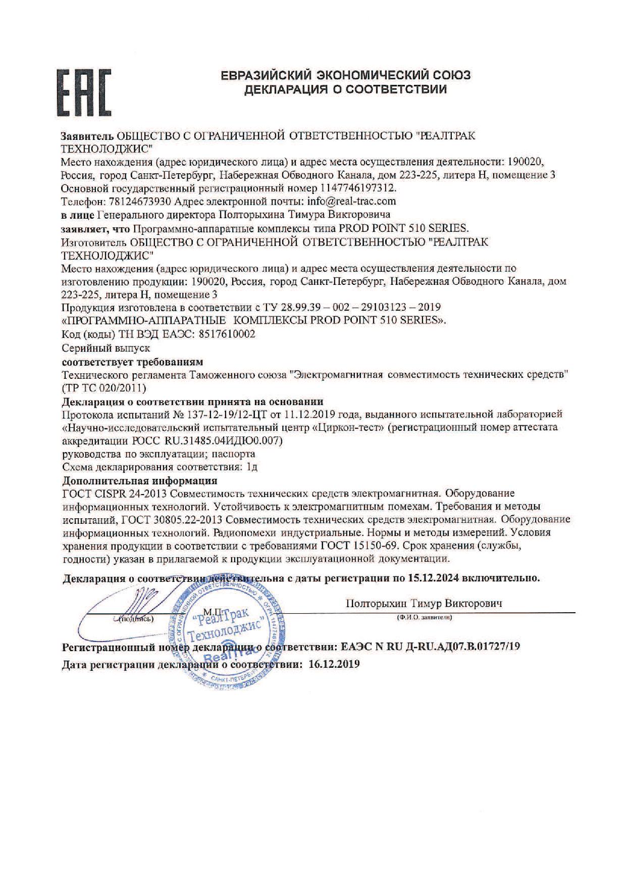 Декларация о соответствии техническому регламенту Таможенного союза "Электромагнитная совместимость технических средств" (ТР ТС 020/2011) на ПРОГРАММНО-АППАРАТНЫЕ КОМПЛЕКСЫ PROD POINT 51X